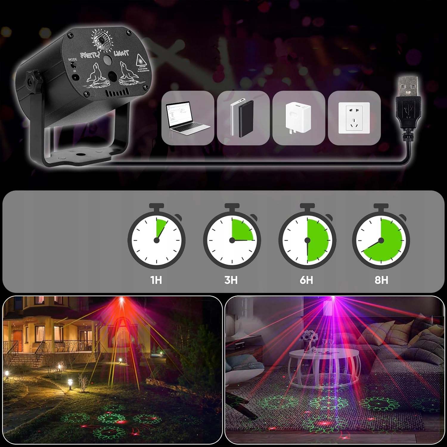 Усовершенствованные лазерные фонари для вечеринок, способные создавать 90 комбинаций изображений, 7 цветовых фонов (красный, зеленый, синий, красный и зеленый, красный и синий, синий и зеленый, красный и синий и зеленый) и 3 комбинации лучей (зеленый, красный, зеленый и красный), создавая более чудесная атмосфера сцены благодаря сочетанию многофункциональных эффектов и высококачественной проекции.