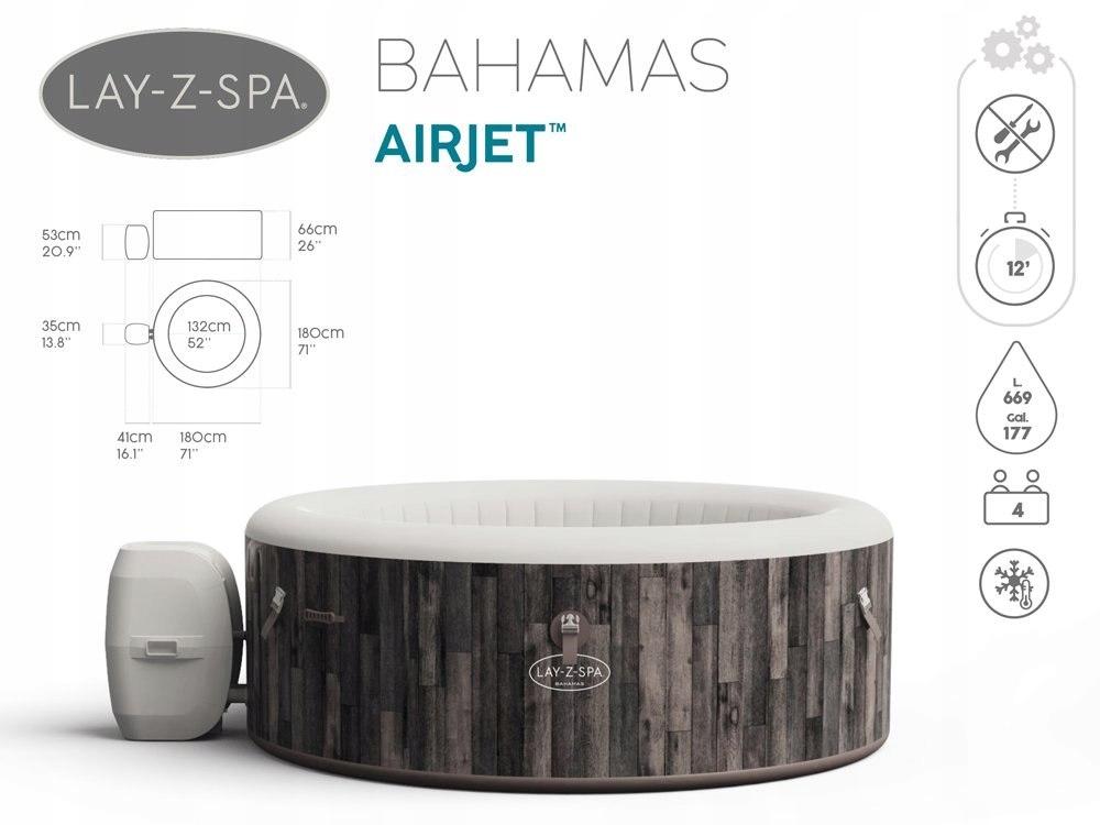 Вместимость массажного бассейна составляет 669 литров воды. Дополнительно гидромассажная ванна оснащена защелкивающейся крышкой, дозатором химикатов ChemConnect, фильтрующим картриджем Flowclear и самоклеящимися ремонтными заплатками.