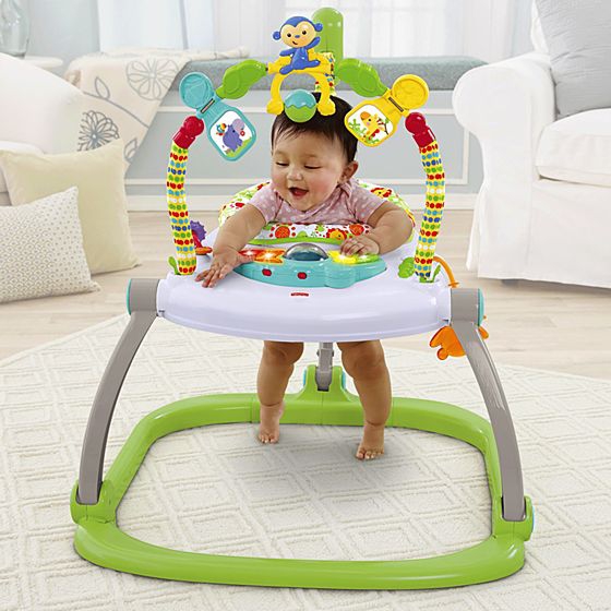 Джемпер Fisher Price оснащен пианино с радужными клавишами, прорезывателем в форме лягушки, щелкающей гусеницей, вращающейся обезьянкой с мячиком, штангой с лязгающими кольцами и двумя вращающимися тропическими друзьями. .