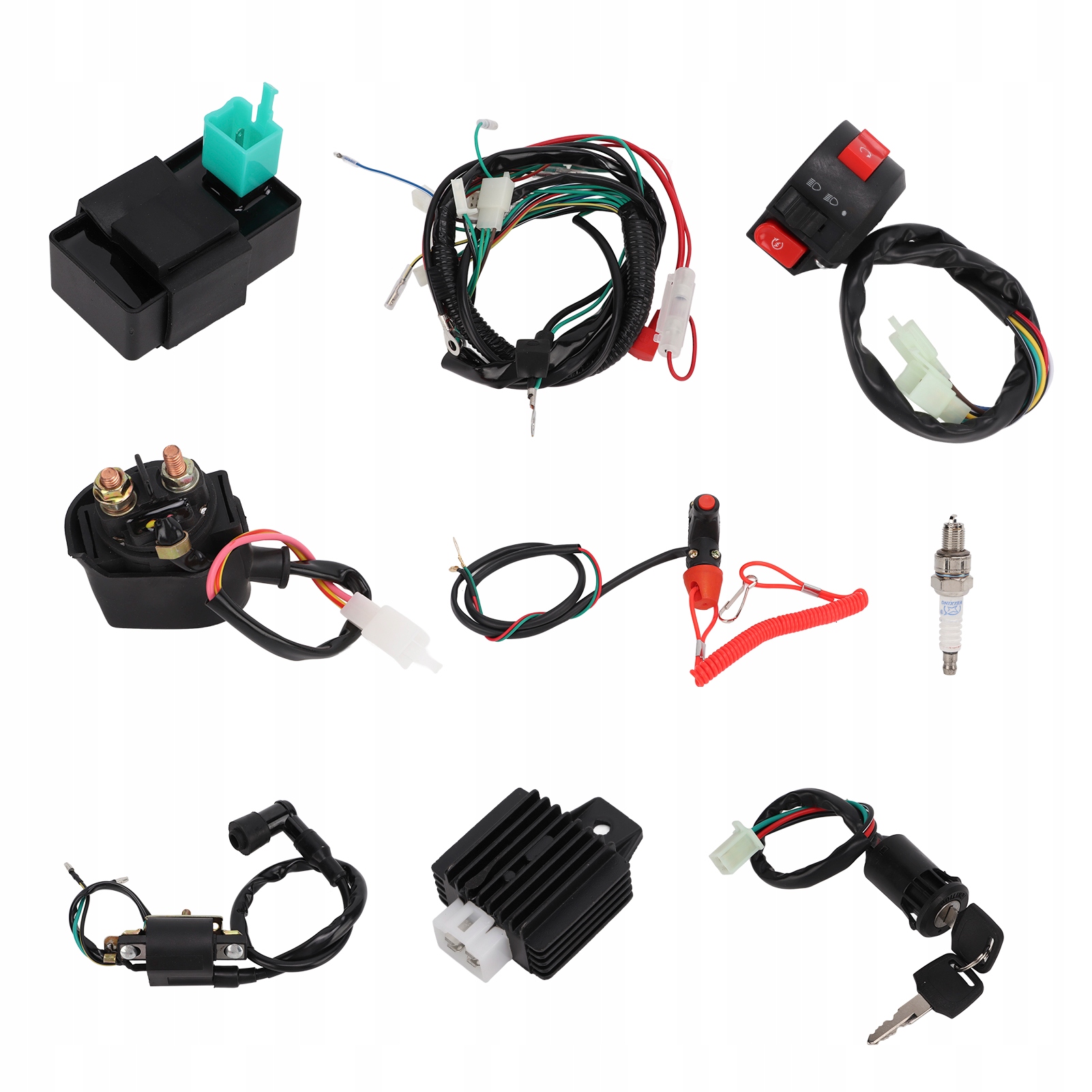 2. Полный комплект: полный жгут проводов для электрического запуска двигателя, включая регулятор, жгут проводов, 4-проводной выключатель зажигания и ключ, катушку зажигания, 5-контактный модуль CDI, корпус переключателя дроссельной заслонки стоп-сигнала, свечу зажигания, электромагнитный клапан и аварийный выключатель.