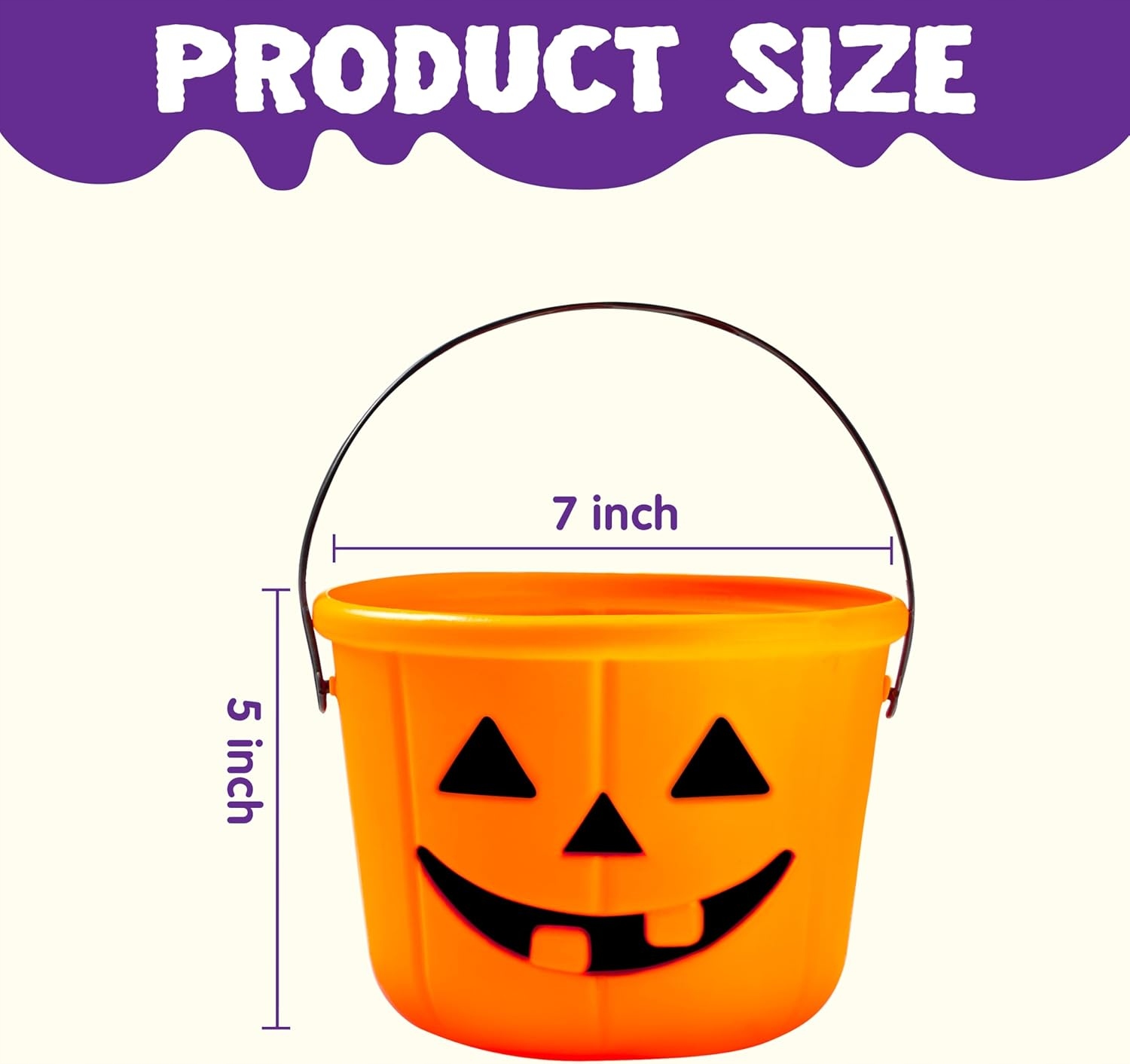 ведро на Хэллоуин имеет размеры 17,8 х 12,7 см. Разработано с ручкой фонаря с подъемом, сделанной из пластика для легкой переноса и сбора сладостей.