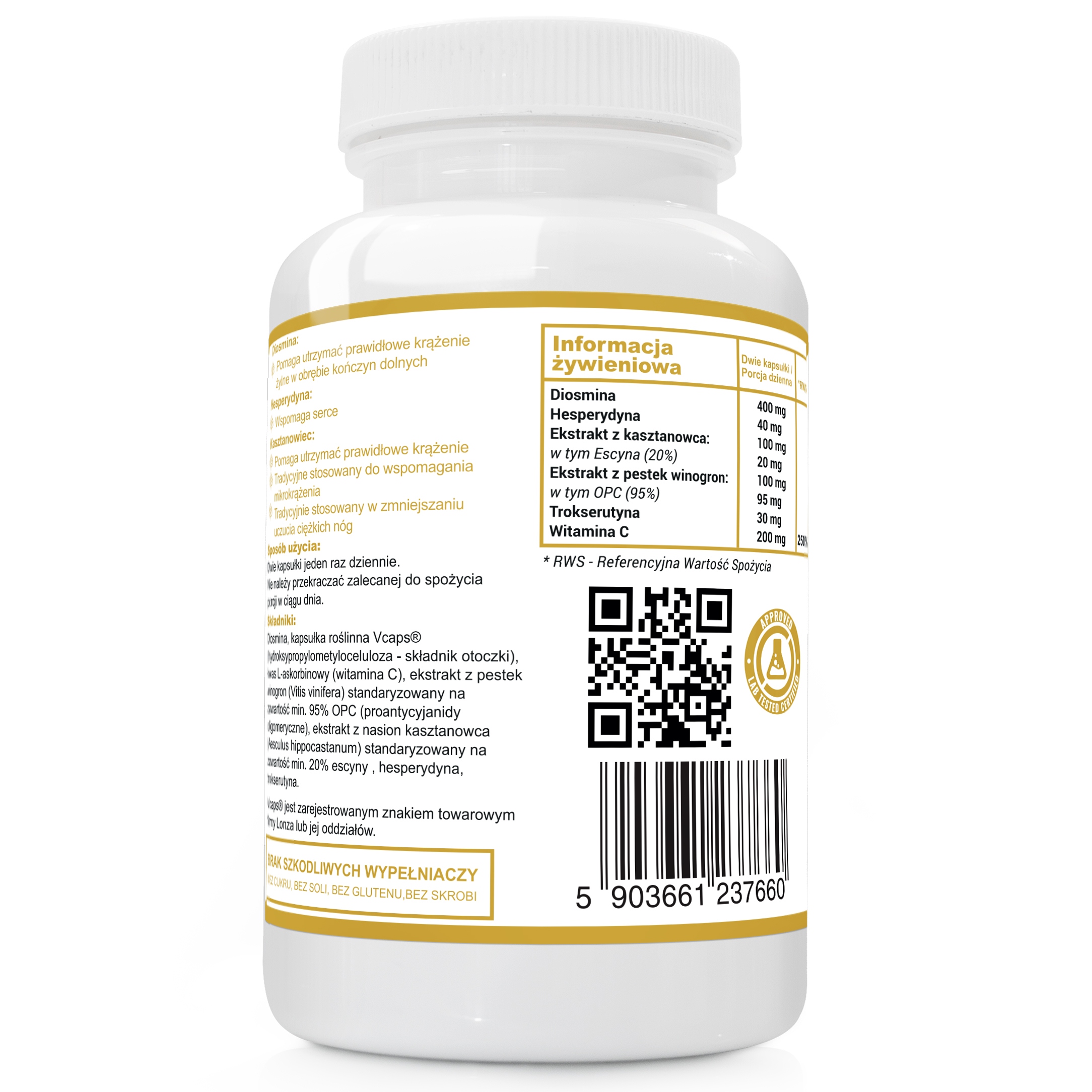 ИНГРЕДИЕНТЫ: Диосмин, растительная капсула Vcaps® (гидроксипропилметилцеллюлоза - компонент оболочки), L-аскорбиновая кислота (витамин С), экстракт виноградных косточек (Vitis vinifera), стандартизированный по содержать мин. 95% OPC (олигомерные проантицианидины), экстракт семян конского каштана (Aesculus hippocastanum), стандартизированный с содержанием мин. 20% эсцин, гесперидин, троксерутин.