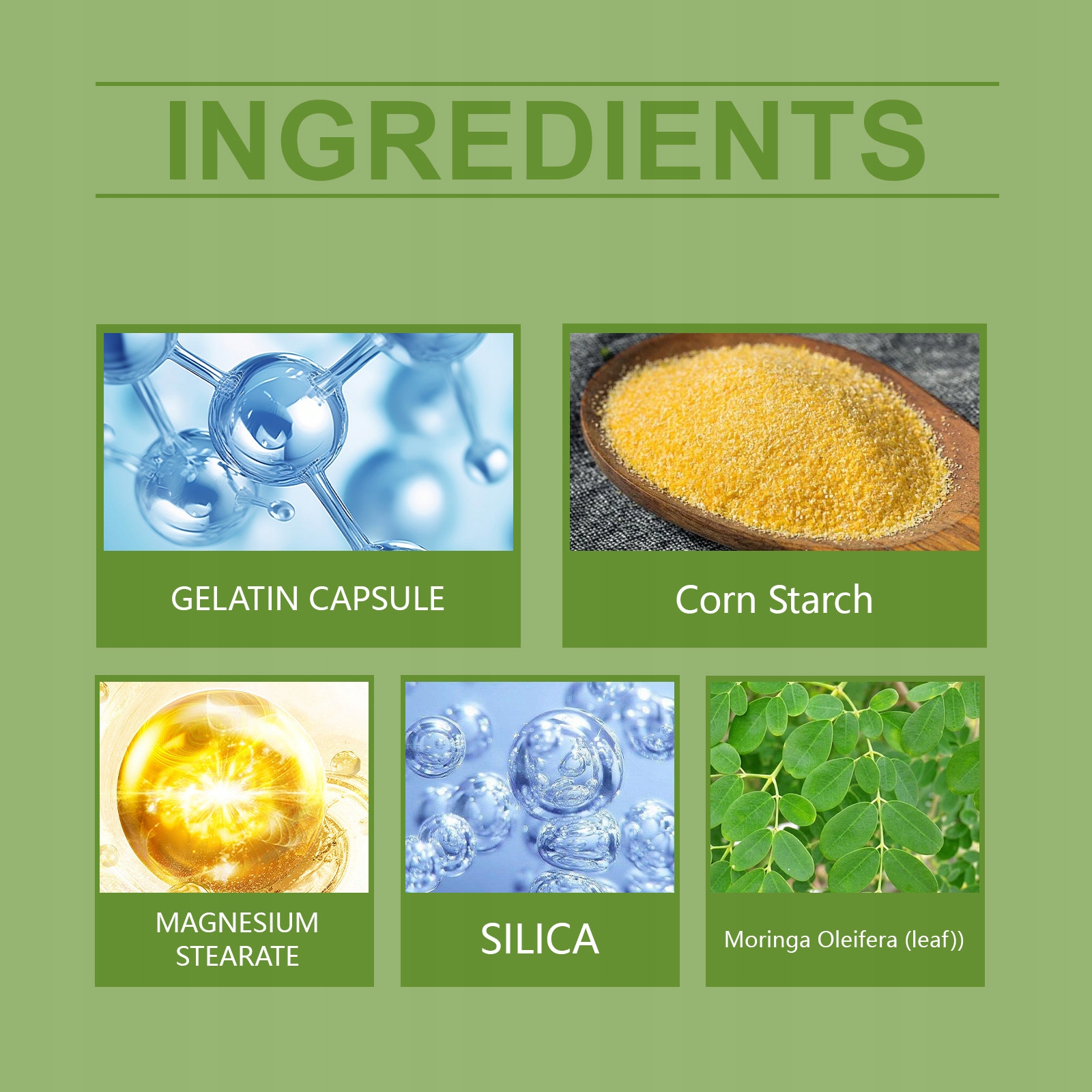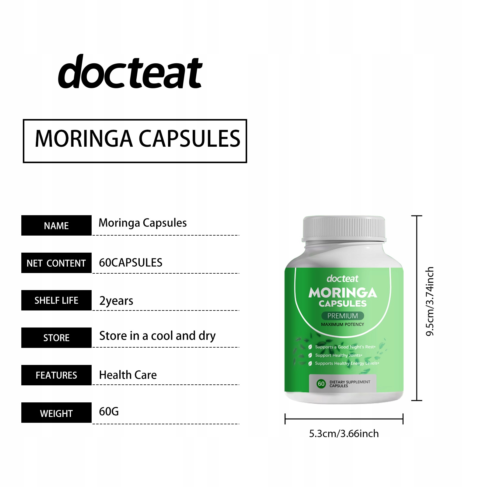 Наши капсулы Моринга, тщательно разработанные с желатиновыми капсулами, рисовой мукой и стеаратом магния. Спроектирован специально для поддержки общего здоровья. Чрезвычайно прост в использовании: принимайте две капсулы в день, питье воду и проглотить целую. Не пережевывайте. И рекомендуется взять его ночью, что в большей степени соответствует темпам жизни. Бутылка была разработана так, чтобы она была достаточно мала для использования дома и при путешествиях.