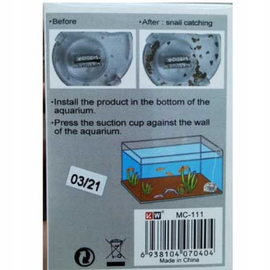 Trap Snail позволяет запечатлеть избыточные улитки в вашем аквариуме. Это удобный инструмент, который очень прост в использовании. Вход передает улитки к приманке, но не позволяет вам покинуть ловушку. Чтобы побудить животных войти, все, что вам нужно сделать, это поместить деликатесу внутрь и установить ловушку на дне резервуара. Уличины, воодушевленные запахом приманки, войдут в ловушку, но они не смогут оставить его . Затем просто удалите его и опустошите от нежелательных арендаторов. Наиболее важным преимуществом ловушки является тот факт, что не нужно использовать какую -либо химию, исключая улитки, которые очень часто также наносят ущерб другими жителями аквариума, таких как ракообразные или декоративные виды моллюсков. Благодаря этому мы можем использовать его в креветках.