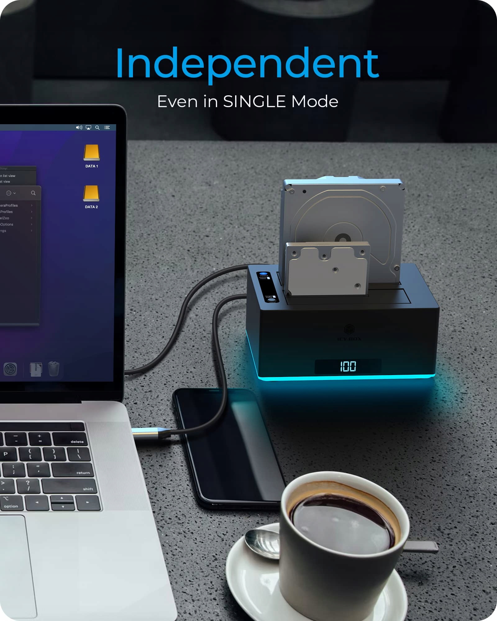 Изящный и стильный алюминиевый корпус с RGB-подсветкой придаст вашему рабочему пространству изысканности, а светодиодный звуковой индикатор сообщит вам, когда ваши накопители работают. Док-станция ICY BOX также поддерживает режим одного диска и технологию HotSwap, позволяющую легко заменять диски в любое время.
