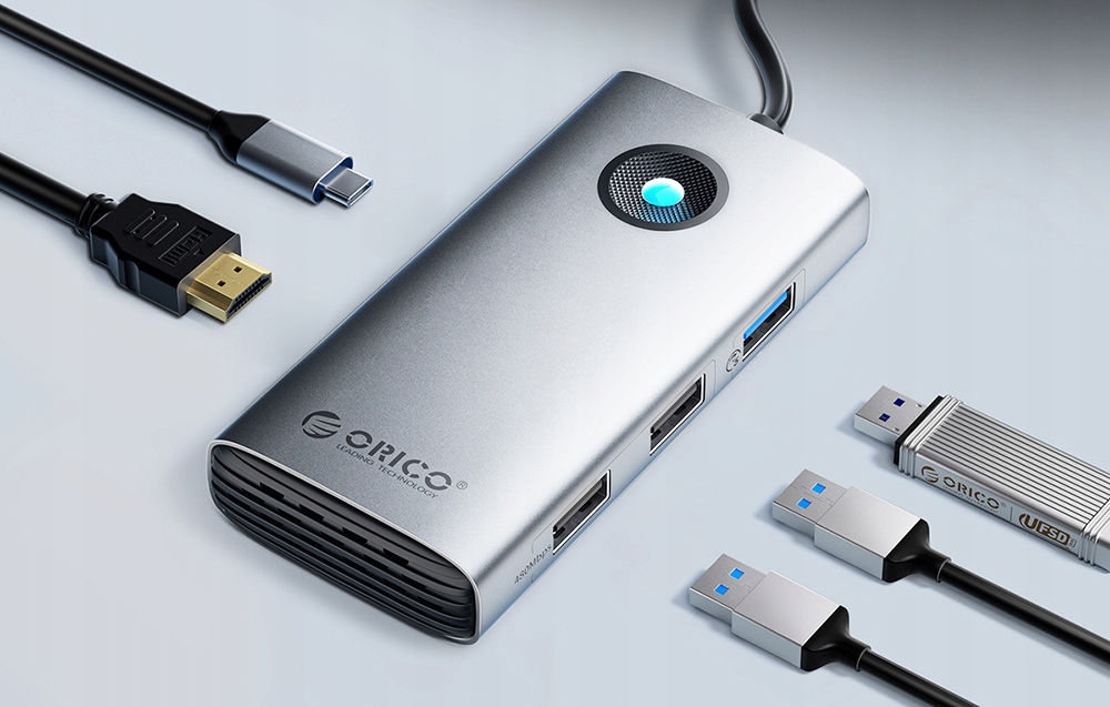 Док-станция Orico — устройство, которое легко расширит возможности вашего ноутбука, планшета или смартфона. Если вам не хватает дополнительного места для подключения необходимых устройств, этот адаптер решит ваши проблемы. С его помощью вы получаете целых пять портов, которые можно использовать одновременно без потери скорости передачи данных.