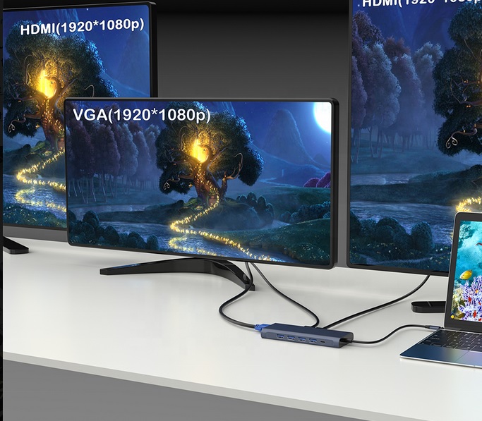 - Полное подключение видео: Помимо двух HDMI, концентратор оснащен портом VGA (1920x1080P@60 Гц). Вы можете подключить до трех дисплеев одновременно (два через HDMI и один через VGA), что значительно повысит вашу производительность.