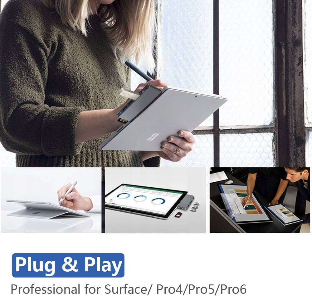 - Идеальное соединение. Особый, скошенный и компактный дизайн этого USB-концентратора идеально подходит для вашего планшета Surface Pro 4/Pro 5/Pro 6 и делает ваш рабочий стол более четким и удобным. прозрачный. Алюминиевый корпус защищает форму и легко отводит тепло. Небольшой вес удобен для путешествий или командировки.