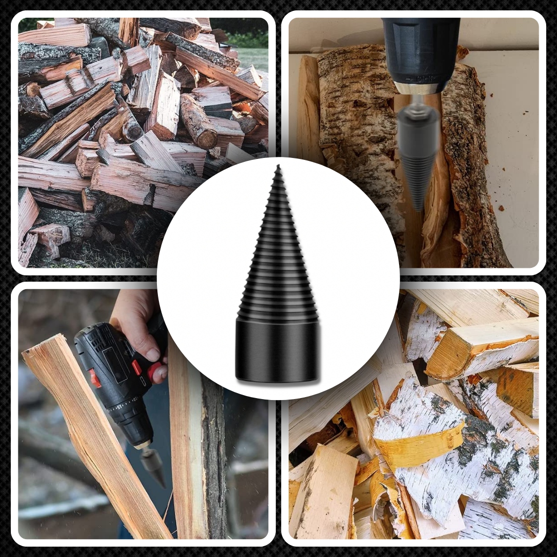 ✅Быстрая и простая сборка: В комплект входят три разных хвостовика/переходника, которые позволяют быстро и легко прикрепить сверло к большинству электроинструментов. Вы сможете быстро подготовить его к работе и начать раскалывать дрова.