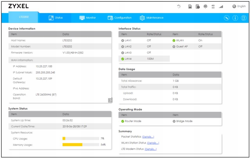 1. Режим маршрутизатора: это режим работы по умолчанию для LTE3202-M430. Если хотите, используйте режим маршрутизатора, чтобы использовать такие функции маршрутизации, как брандмауэр, DHCP, NAT и т. д. На рисунке ниже показан пример LTE3202-M430 в режиме маршрутизатора.