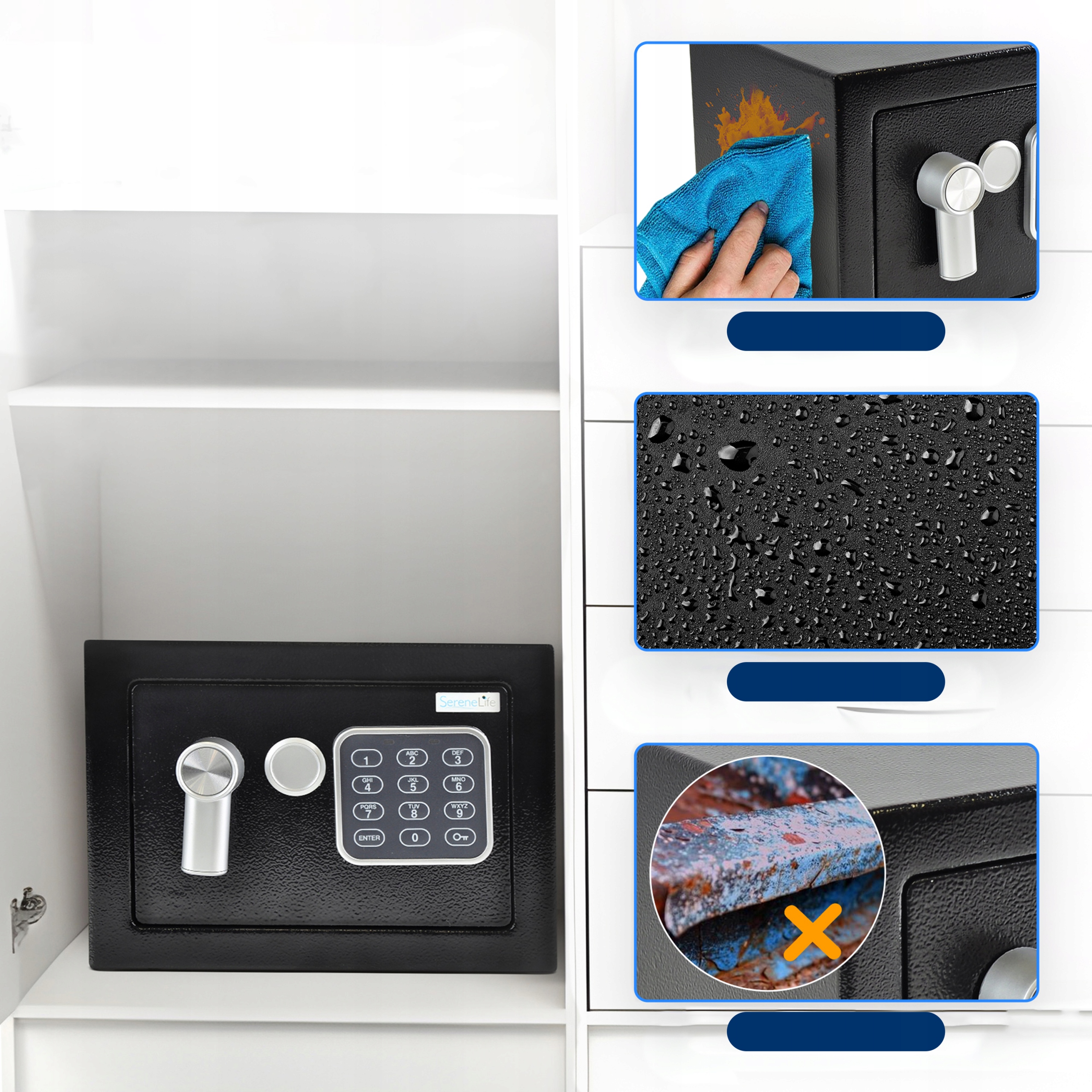 Сейф, изготовленный из прочного стального сплава, предназначен для защиты денежных средств, документов, ювелирных изделий и других ценных вещей при сохранении компактных размеров для незаметного размещения в шкафу, под столом или в гостиничном номере