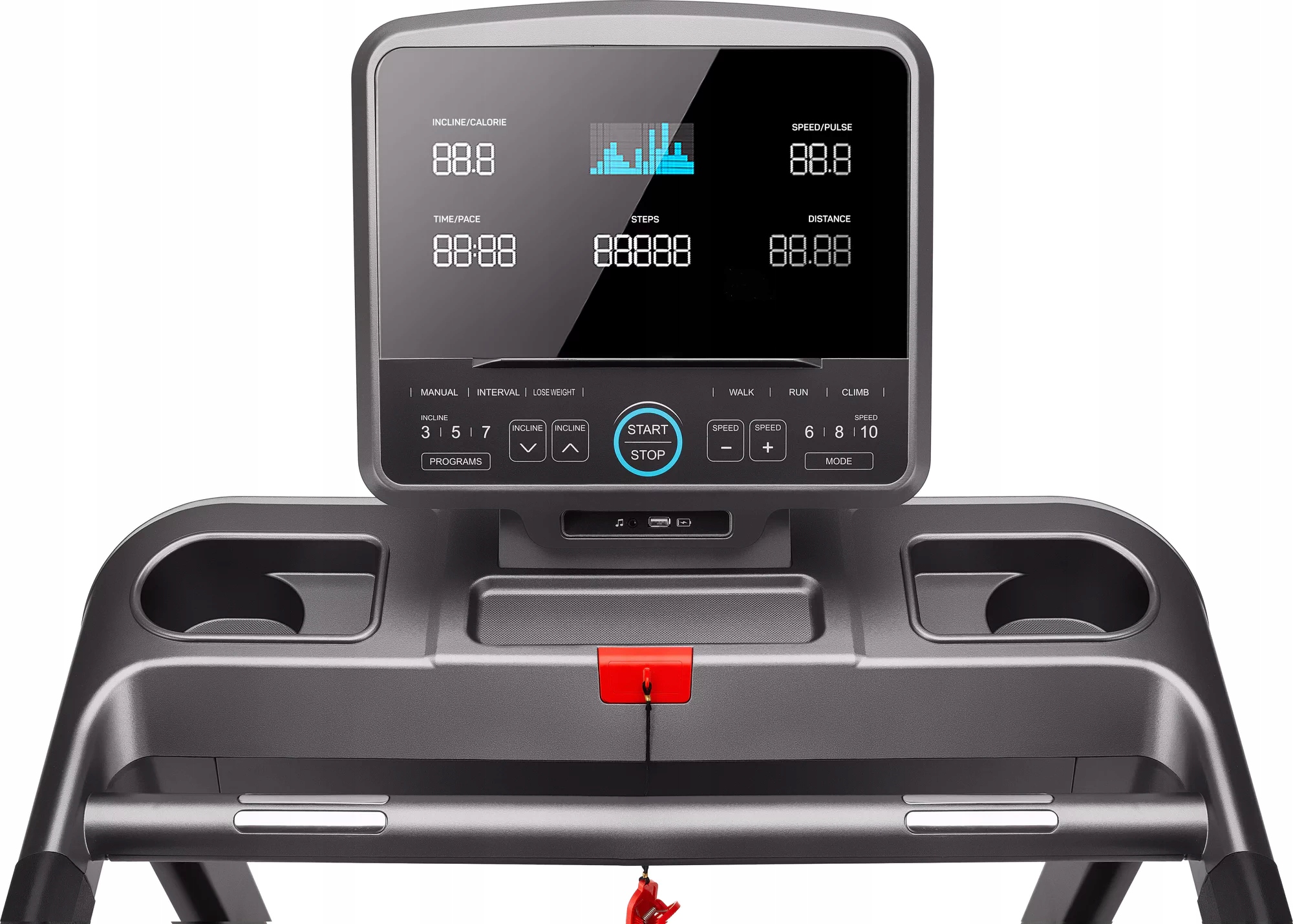 Беговая дорожка XT850 Gymtek оснащена прозрачной панелью со светодиодным дисплеем. Благодаря этому вы сможете управлять устройством. Специальный ключ также обеспечивает безопасность. Все это делает беговую дорожку практичным тренажером в каждом доме.