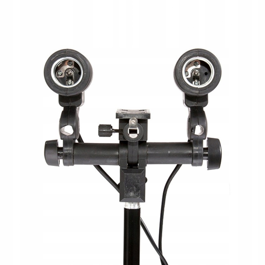 Светильник двойной предназначен для ламп постоянного света и компактных ламп-вспышек с резьбой E27. Это элемент, который соединяет все компоненты набора. На него можно установить осветительный (фотографический) зонт. Патрон предназначен для установки на осветительные стойки. Преимуществом является легкий и прочный материал, что обеспечивает его долговечность в течение длительного времени. По сравнению с другими моделями светильник имеет небольшие габариты и очень легко регулируется. Головка подвижна в диапазоне +80°/-80°. Двухжильный кабель имеет длину 1,3 м.