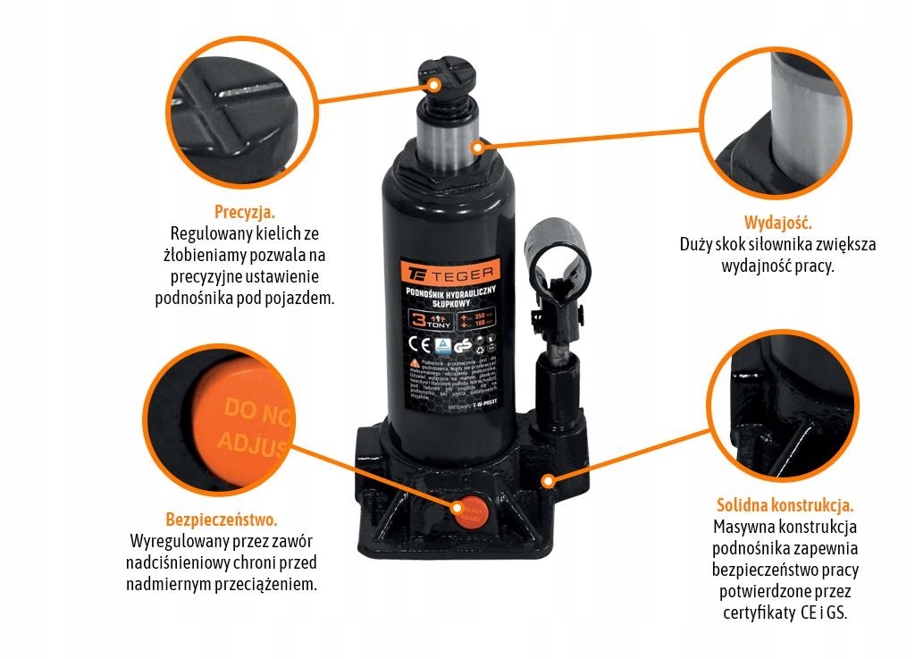 Гидравлический стоечный подъемник 3T / TEGER Профессиональный подъемник для универсального использования в автомобильных и сельскохозяйственных мастерских, домашних гаражах, станциях техосмотра и шиномонтажных мастерских. Его можно точно отрегулировать по высоте благодаря дополнительному ввинчивающемуся штифту. Клапан избыточного давления защищает от перегрузки, а большой ход привода повышает эффективность. Изготовлен из высококачественной стали, что обеспечивает достаточную жесткость и долговечность, а простая и прочная конструкция повышает безотказность работы устройства. Небольшой размер гарантирует простоту использования и высокую мобильность. Идеально подходит для фермера – благодаря удобному кейсу его можно удобно транспортировать в машине. Стабильная, прочная и безопасная конструкция соответствует европейским стандартам CE, сертифицирована TÜV Rheinland и GS.