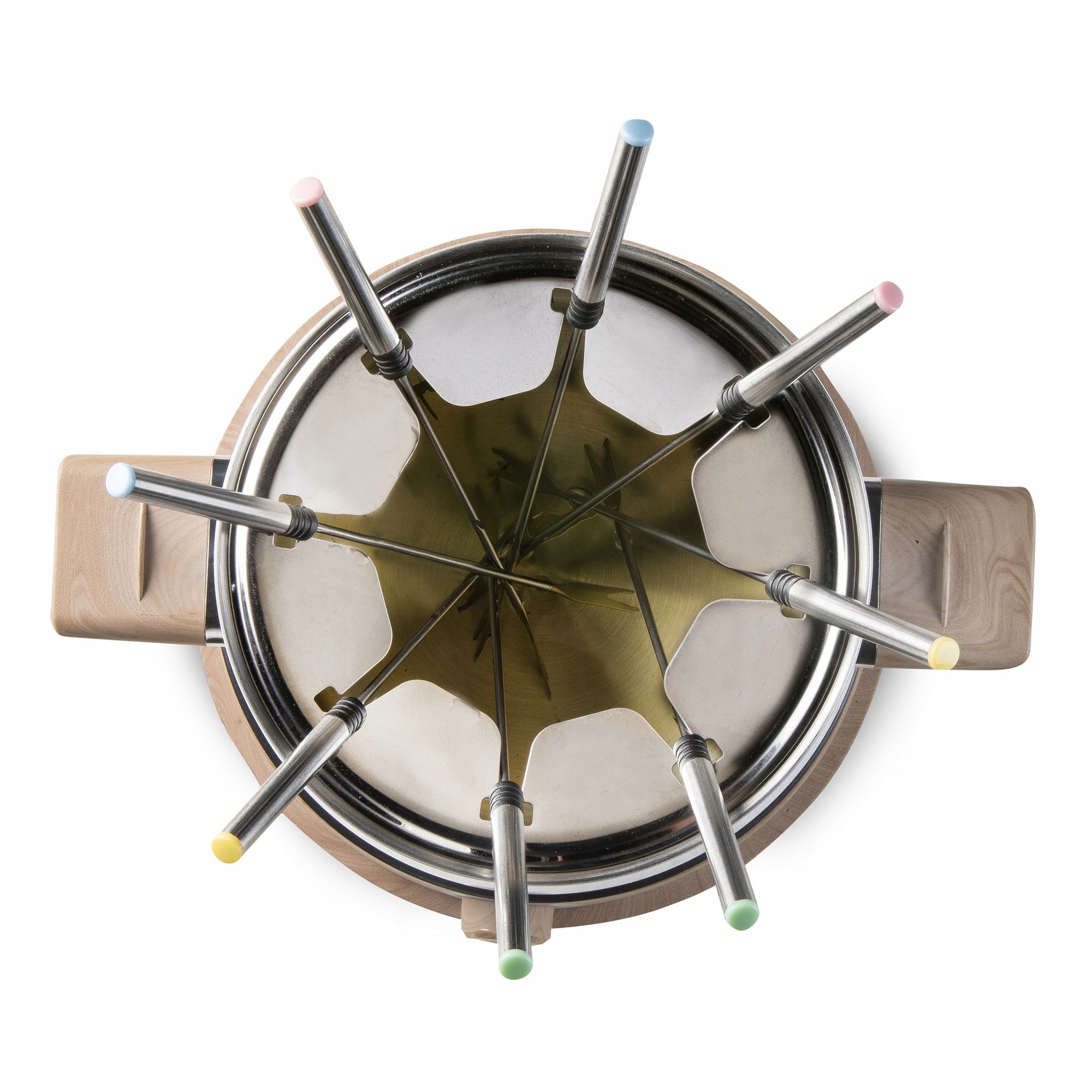 У каждого есть своя вилка с восемью вилками из нержавеющей стали с цветовой маркировкой. Более того, фондюшница остается на месте благодаря нескользящим ножкам.