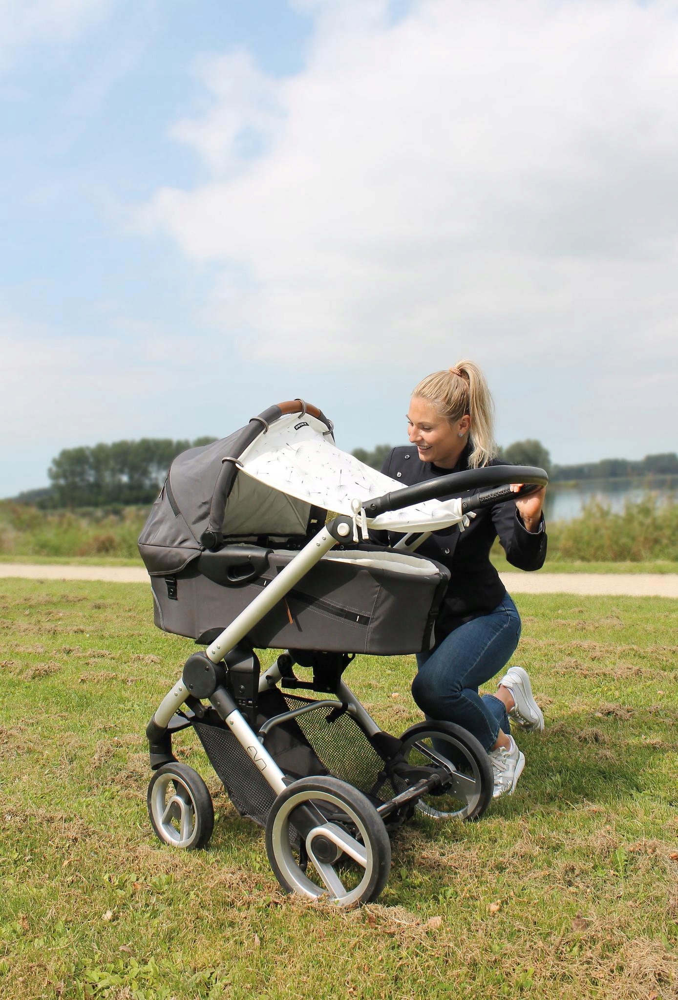 Уникальная запатентованная система позволяет регулировать чехол на любой высоте с помощью липучки. Когда ребенок спит, его можно свернуть полностью вниз, чтобы обеспечить тень и тишину, а когда он просыпается, его можно свернуть наполовину или полностью вверх, чтобы обеспечить зрительный контакт.