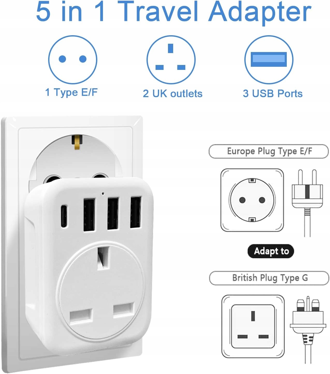 Дорожный адаптер ЕС «5 в 1» — 1 сетевая розетка для Великобритании + 1 розетка типа C + 3 порта USB-A, позволяет заряжать до 5 устройств одновременно. Совместимо со всеми электронными устройствами USB-A и Type-C, а также небольшими устройствами, предназначенными для Великобритании, такими как iPhone 13, 12, 11, iPad, мобильные телефоны, часы, камеры, ноутбуки, планшеты и многое другое.