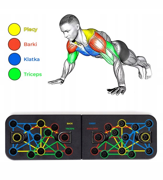 4 цвета обозначают, какие части тренируются с заданной настройкой ручки. Благодаря такому простому решению вы можете легко выберите тренировку, и вы сосредоточитесь на наиболее важных для вас мышцах. Кроме того, с помощью эспандеров можно тренировать бицепсы и ягодицы.