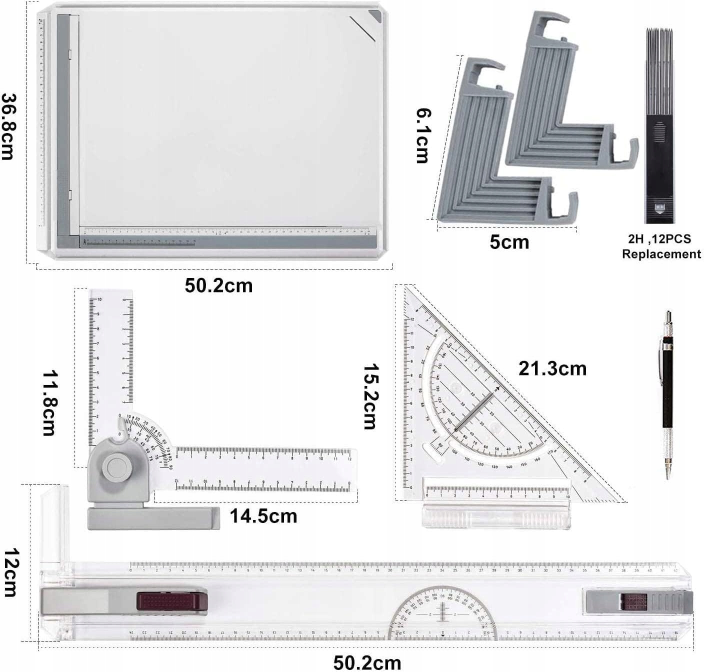 Доска для рисования поставляется с прозрачной скользящей линейкой, транспортиром на 180 градусов, изометрическими линиями штриховки, длинными направляющими, быстросъемными скрепками для бумаг, 45 квадратами и 2 нескользящими ножками, которые можно прикрепить к задней части подъемника. . Все детали съемные. Его свойства делают его очень простым и удобным рабочим положением для рисования и черчения.
