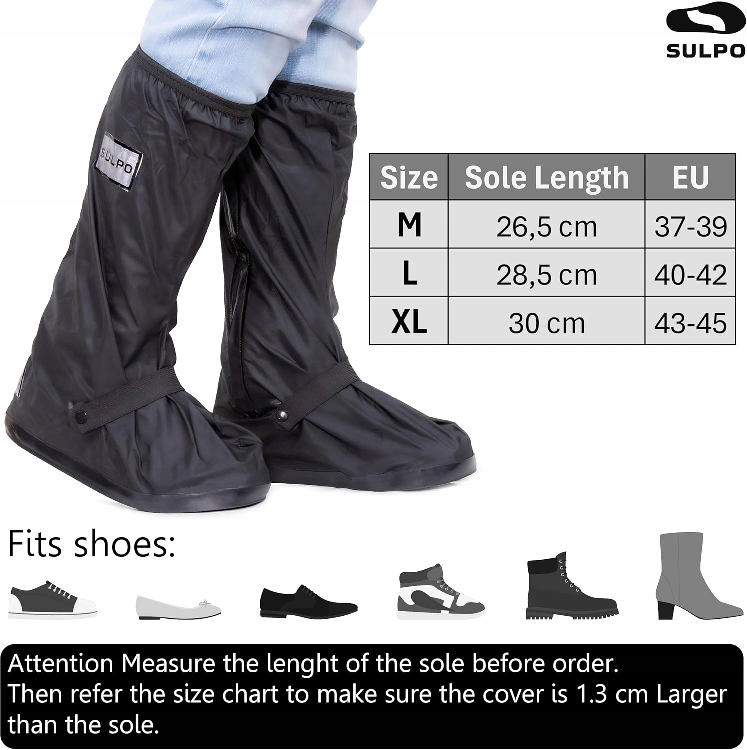 <р> Легкость и компактность делают их идеальным спутником в путешествии, они поместятся в любую сумку. Эластичные ремни обеспечивают идеальную посадку и удобство использования. <р> Прочные, прочные материалы и резиновая подошва обеспечивают долговечность. Светоотражающие полосы улучшают видимость в условиях низкой освещенности и обеспечивают вашу безопасность. <р> Выберите наши защитные средства, чтобы наслаждаться сухими ногами независимо от ситуации, во время поездок на работу, езды на велосипеде или фестивалей.Параметры продукта