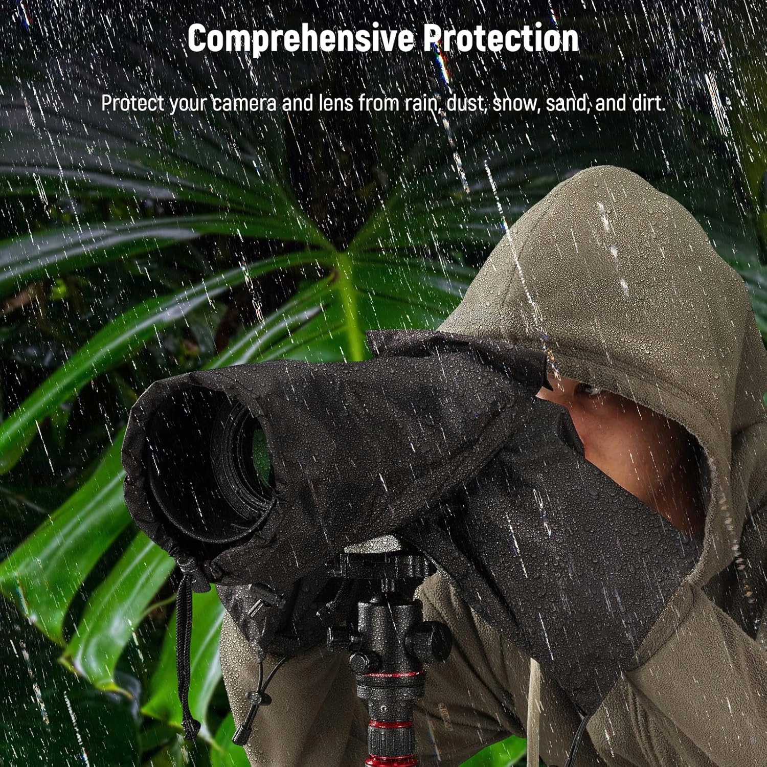 Этот водонепроницаемый нейлоновый дождь защищает камеру и линзу от дождя, пыли, снега, песка и грязи при фотографировании в сложных внешних условиях. Два рукава позволяют рукам добраться до крышки дождя и управлять камерой без препятствий. Ремень камеры может быть подключен к крышке дождя с двумя отверстиями на ремне.