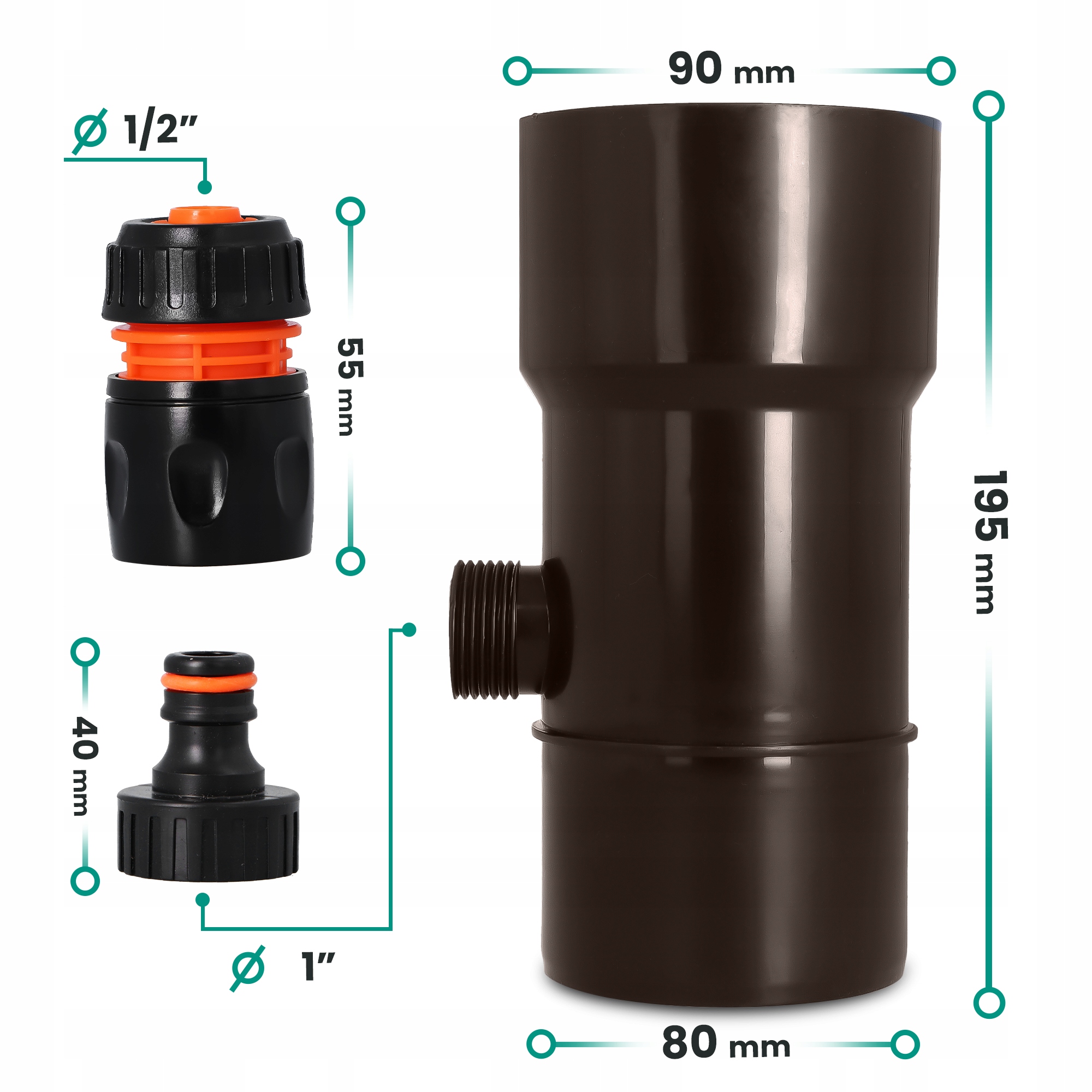 Сборник дождевой воды 90 мм x 1 дюйм П, коричневый, с подключением для быстрого соединения GW x SZ 1 дюйм и быстрого соединения Ш x SZ 1/2 дюйма