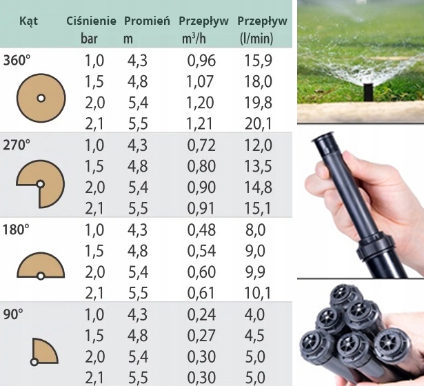 Весмошные разбрызгиватели в наборе характеризуются высокой эффективностью, что позволяет эффективно орошение различных областей сада. Технические данные для индивидуального давления и углов орошения представлены в таблице.