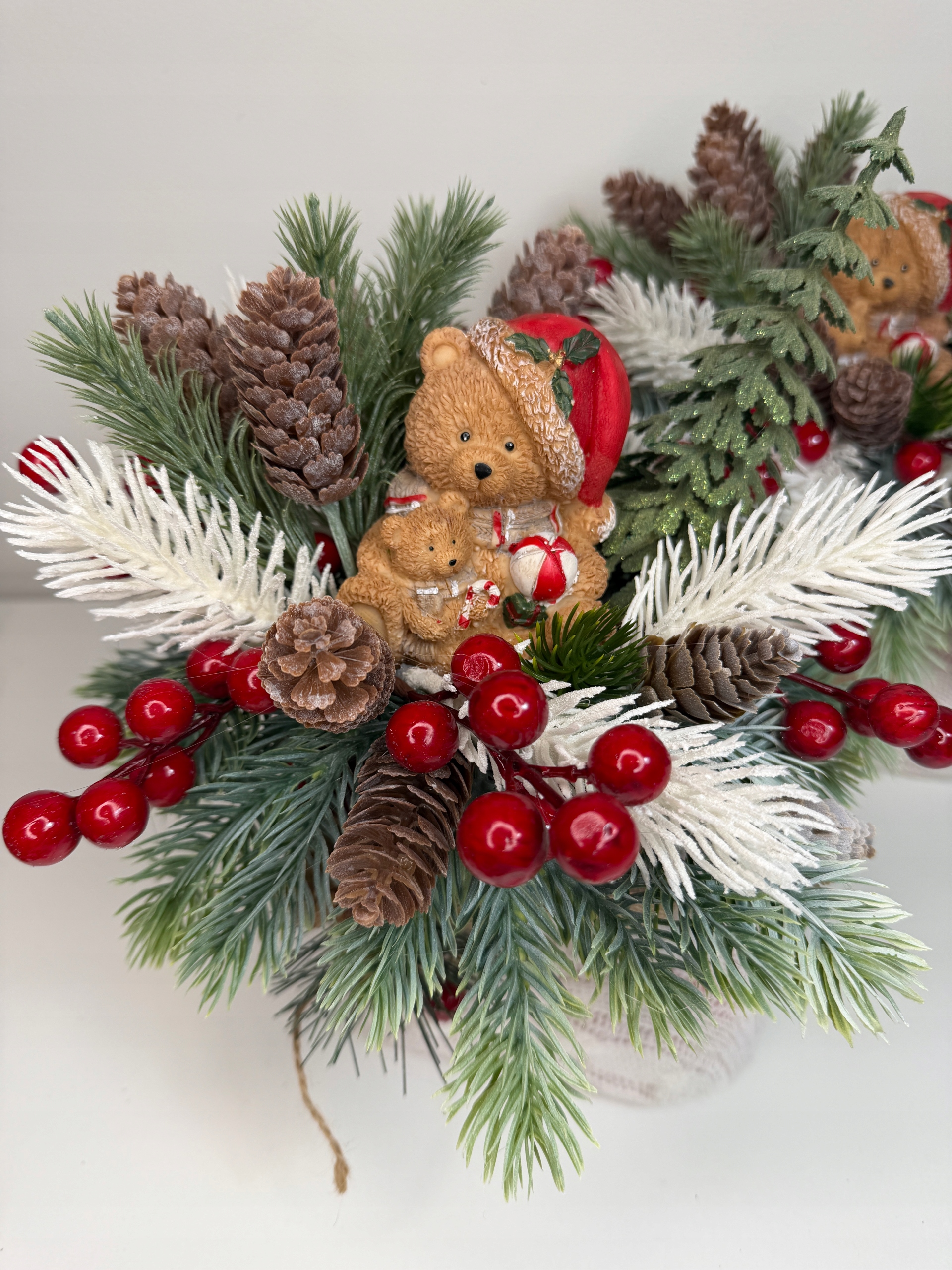 Полно зимних веточек, сосновых шишек, красных ягод и милого плюшевого мишки, который сразу создаст рождественское настроение. Идеально подходит для стола, комода, подоконника или в подарок. 🌟