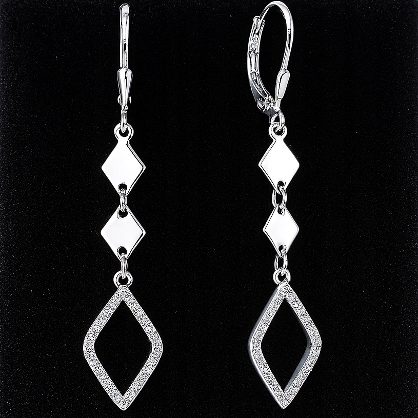Длинные серебряные серьги с цирконами-ромбами, серебро 925 пробы