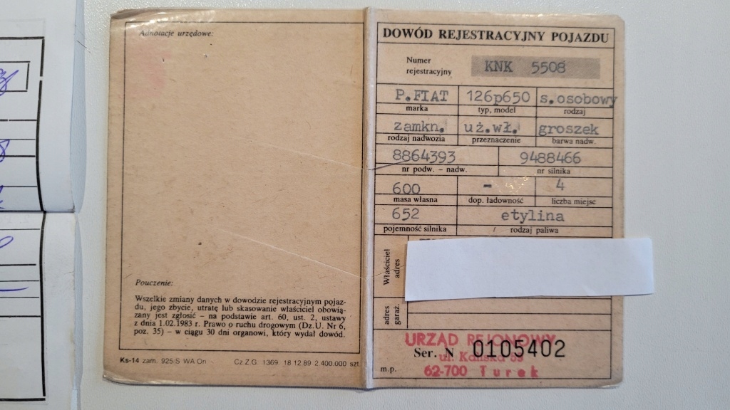 DOWÓD KOLEKCJONERSKI P.FIAT 126 P 1986 + PRZEGLĄD
