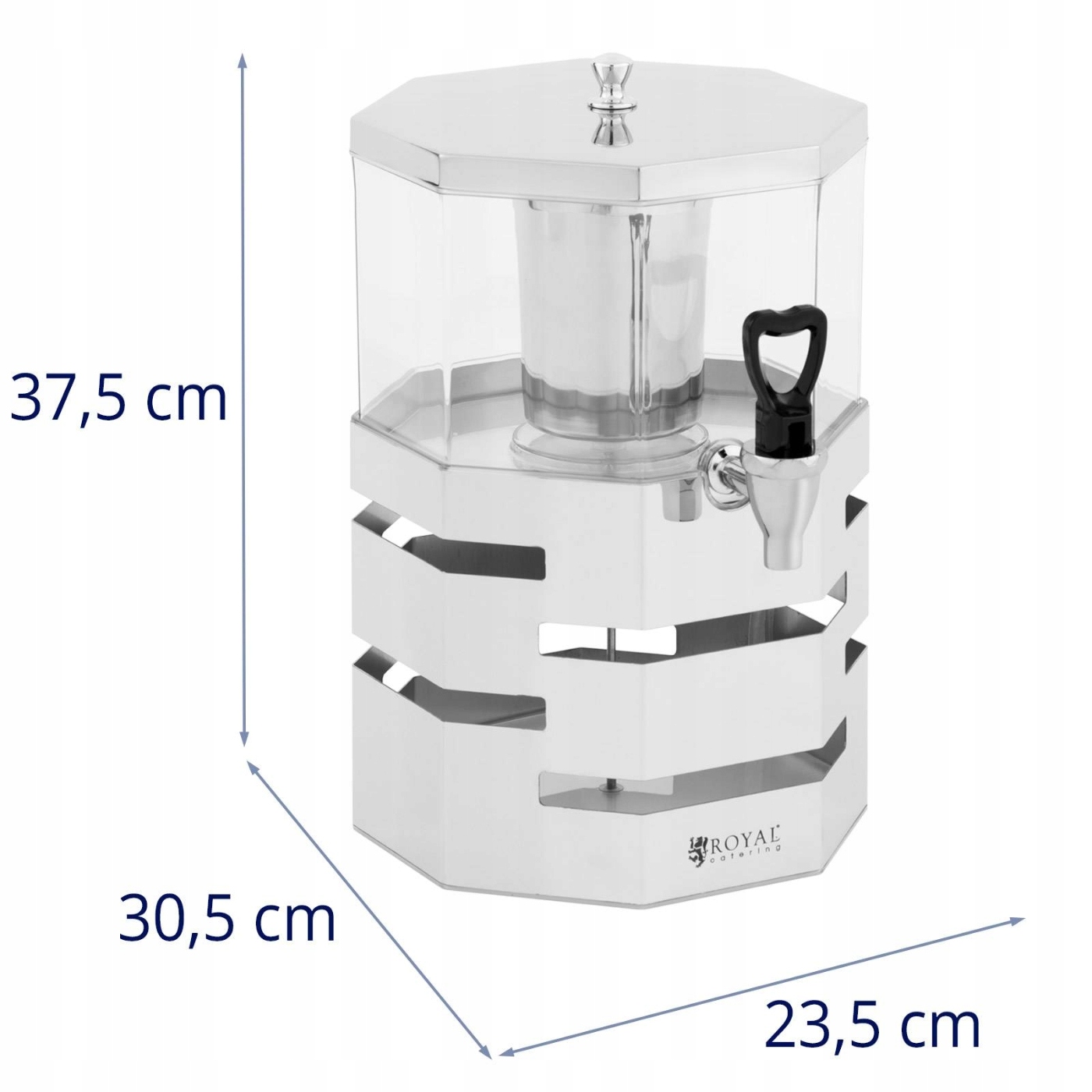 Вы предлагаете холодные или горячие напитки для самообслуживания? Тогда воспользуйтесь дозатором сока от Royal Catering. Будь то фуршет в отеле, ресторане или кейтеринговое мероприятие, управление диспенсером для напитков с помощью крана — детская игра. Внутри резервуара находится съемная система охлаждения из нержавеющей стали, в которую можно класть кубики льда. Таким образом вы охладите содержимое диспенсера для сока, не разбавляя напиток.