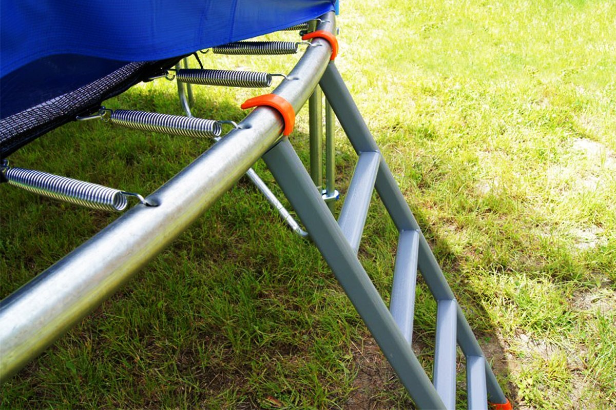 - В верхней части конструкции лестница отделана крючками для крепления к краю батута.