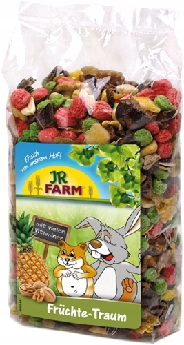 JR Farm FRUIT DREAM вкусный и питательный перекус для грызунов, особенно мышей, крыс и хомяков. В состав смеси входят абрикосы, питательные орехи и семена, а также вкусные бананы и ананасы.