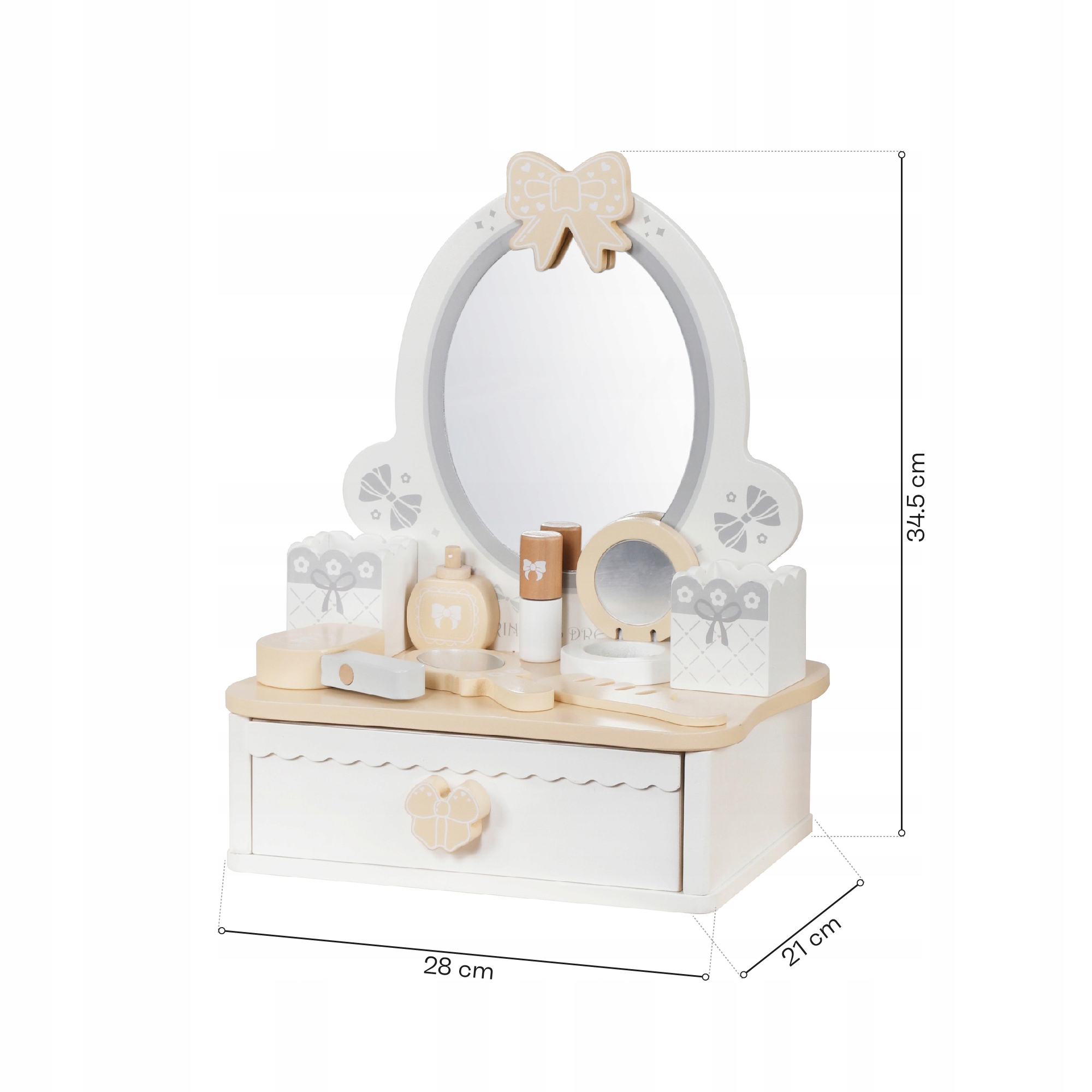 Большое безопасное зеркало позволит вам точно сделать и восхищаться прически, а функциональный и удобный ящик поможет заказать порядок как привязку, так и украшения Маленькая леди