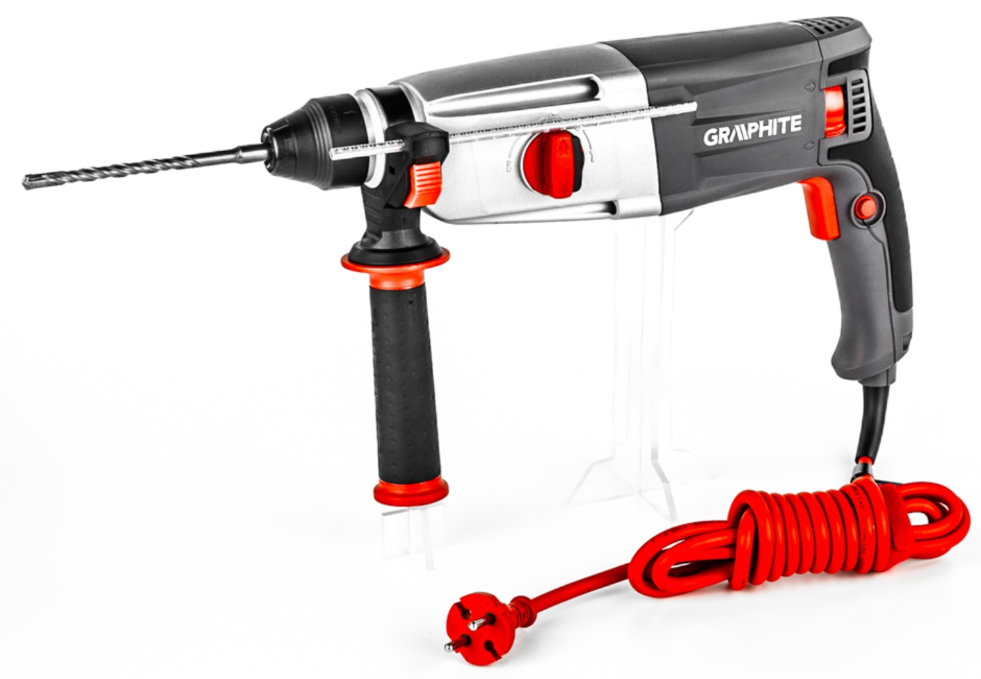 Ударная дрель SDS+ GRAPHITE с четырьмя функциями и высокой мощностью 900 Вт имеет функции сверления с молотком, сверления без молотка, функцию долбления и уникальную возможность бесступенчатой регулировки угла долота для точного долбления. p>