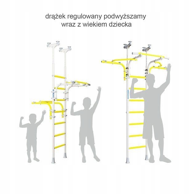Данный комплекс упражнений оснащен регулируемой по высоте перекладиной и дополнительными кронштейнами, расположенными по обе стороны от нее. лестница. Их используют для подвешивания дополнительных элементов: гимнастического каната, веревочной лестницы, гимнастических обручей. Боковые кронштейны также можно использовать в качестве дополнительной перекладины, которую можно установить на любой высоте.