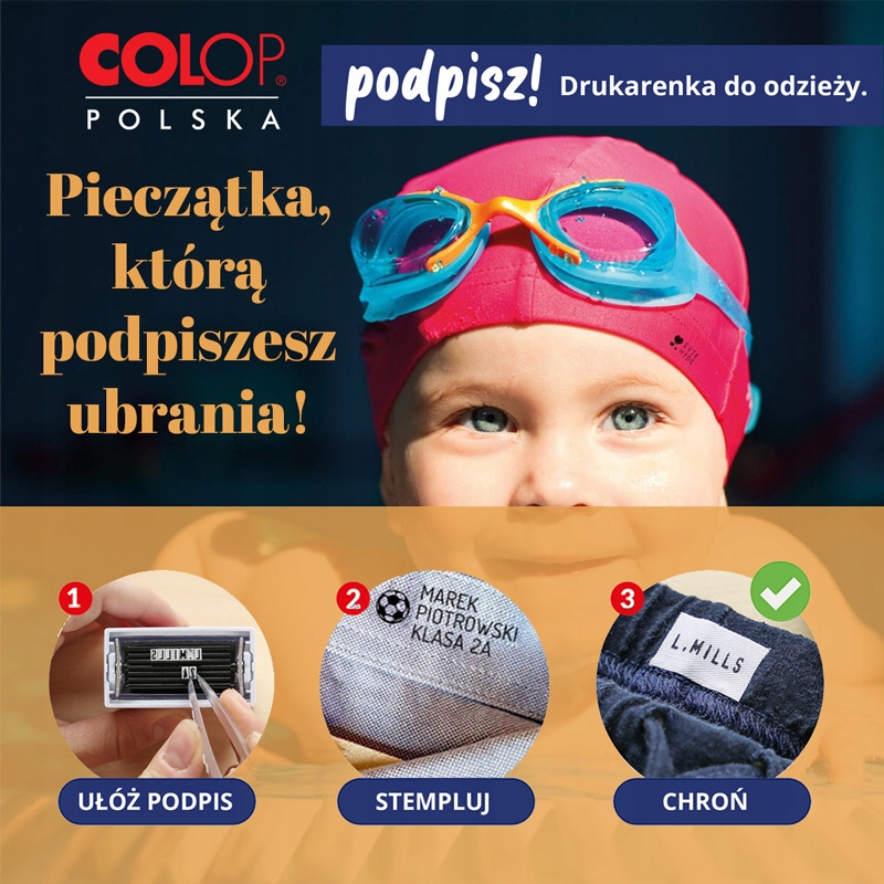 Одежный штамп COLOP оснащен тканевыми чернилами. Специализированные чернила не засыхают в штампе и в то же время не размазываются по поверхности материала. Поскольку штамп представляет собой принтер, пользователь может изменять содержимое изображения штампа несколько раз. Набор шрифтов оснащен польскими буквами, цифрами и специальными символами, которые позволяют полностью персонализировать содержимое отражения.