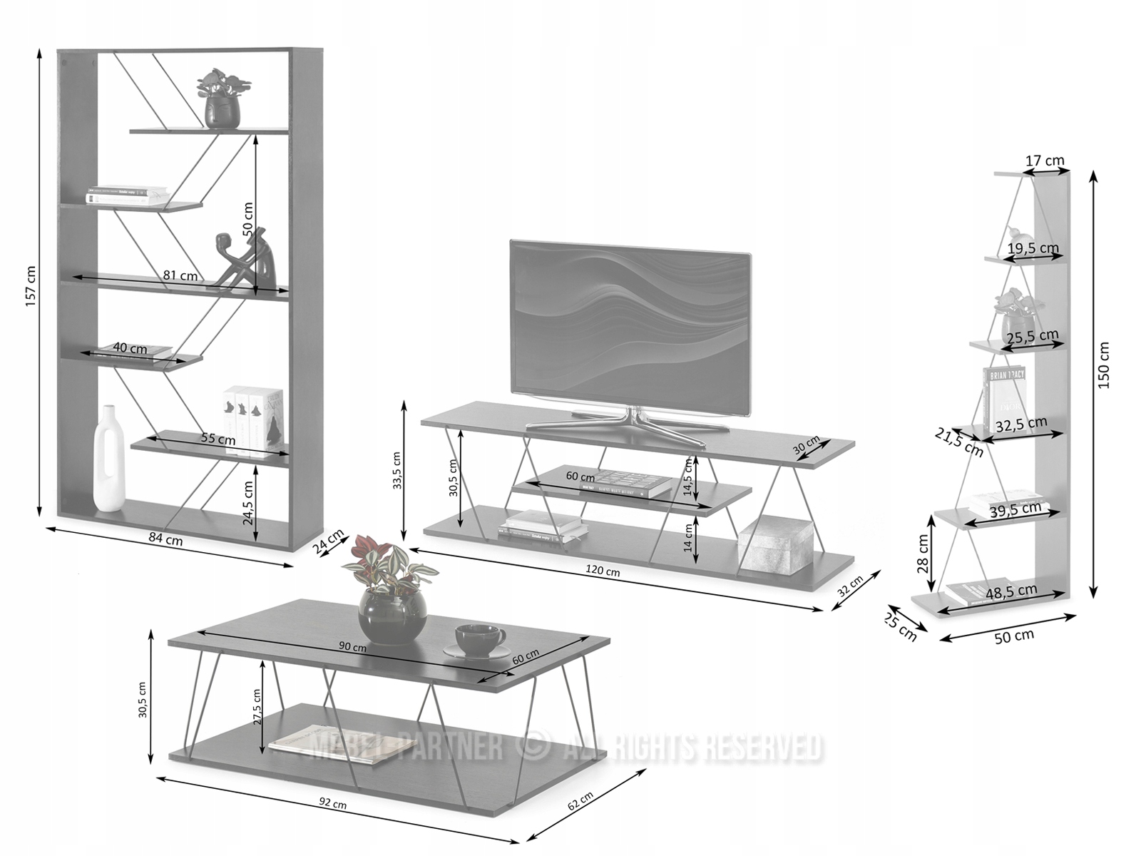 - количество элементов – две полки, тумба под телевизор и журнальный столик,