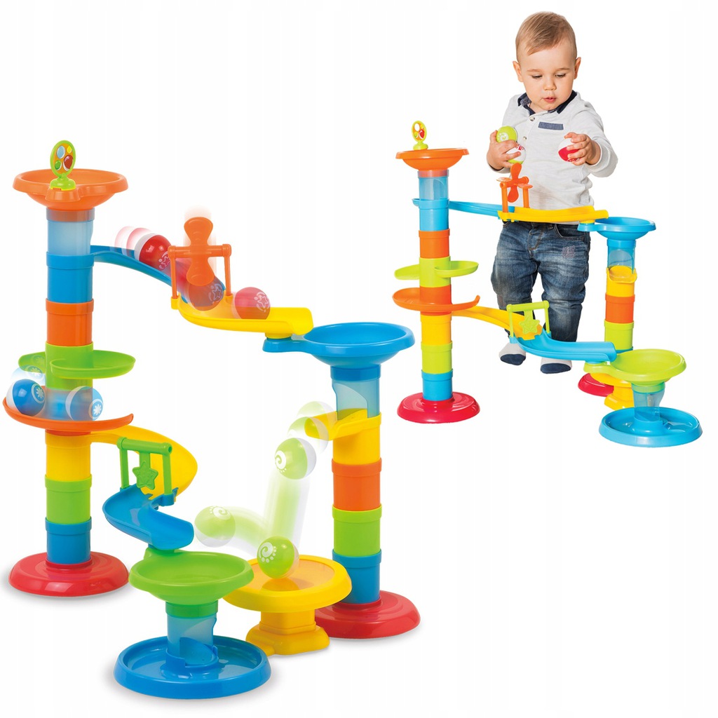 Постройте огромную горку с двумя дорожками, оснащенными вращающимися элементами, и батутом, который подпрыгивает на падающих шариках.
