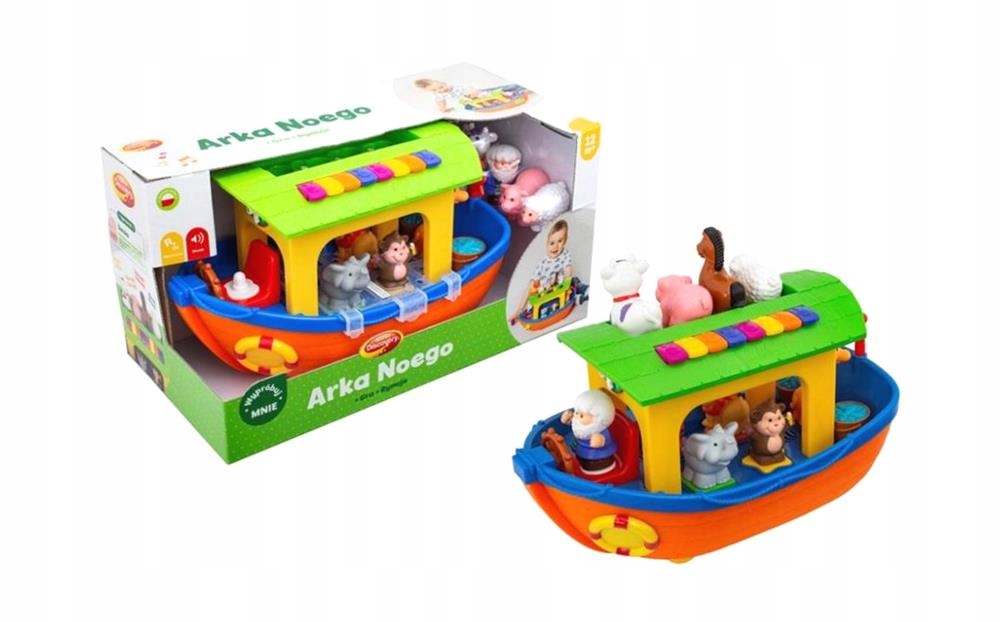 Нойский ковчег содержит 9 животных, которые будут вознаграждать детей реалистичными звуками или забавным детским рифмой каждый раз, когда они догадаются правильной формой и ставят их в нужном месте. После поворота приоритет ARKA издает реалистичные звуки. У игрушки есть красочное мини -пианино, где вы можете играть в свою собственную композицию. Можно прикрепить строку к ковчегу, с которой она может быть выполнена ребенком.
