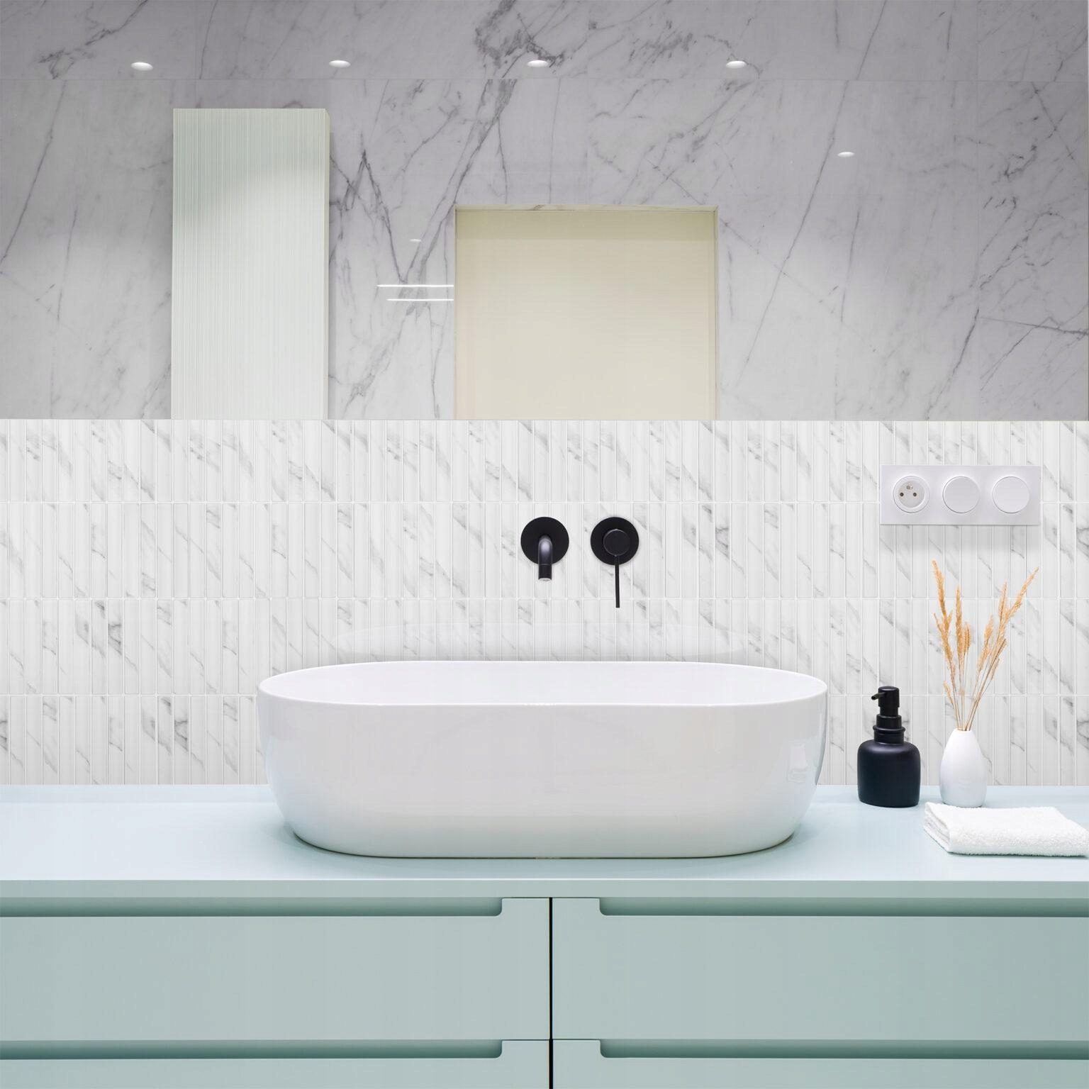 Матовая мозаика, имитирующая каррарский мрамор, – идеальное решение для тех, кто хочет совместить классическую эстетику мрамора с долговечностью современных материалов. Эта мозаика, вдохновленная знаменитым каррарским мрамором, отличается элегантным белым фоном с нежными серыми прожилками, которые придают интерьеру вневременной шик и роскошь.