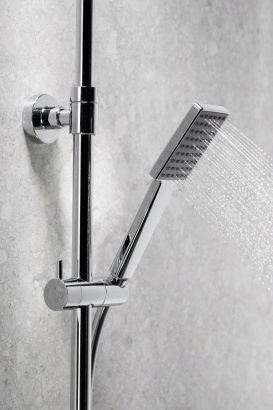 Дизайн всего изделия един - квадратный диск тропического душа идеально сочетается с кубической формой термостатического смесителя. Что немаловажно, форма ручек — это не только внешний вид, но и эргономика: мы уверены, что она не выскользнет из мокрой руки. Встроенный переключатель душа оснащен блокировкой для комфортного использования выбранного режима – душевой ручки или разбрызгивающего диска.