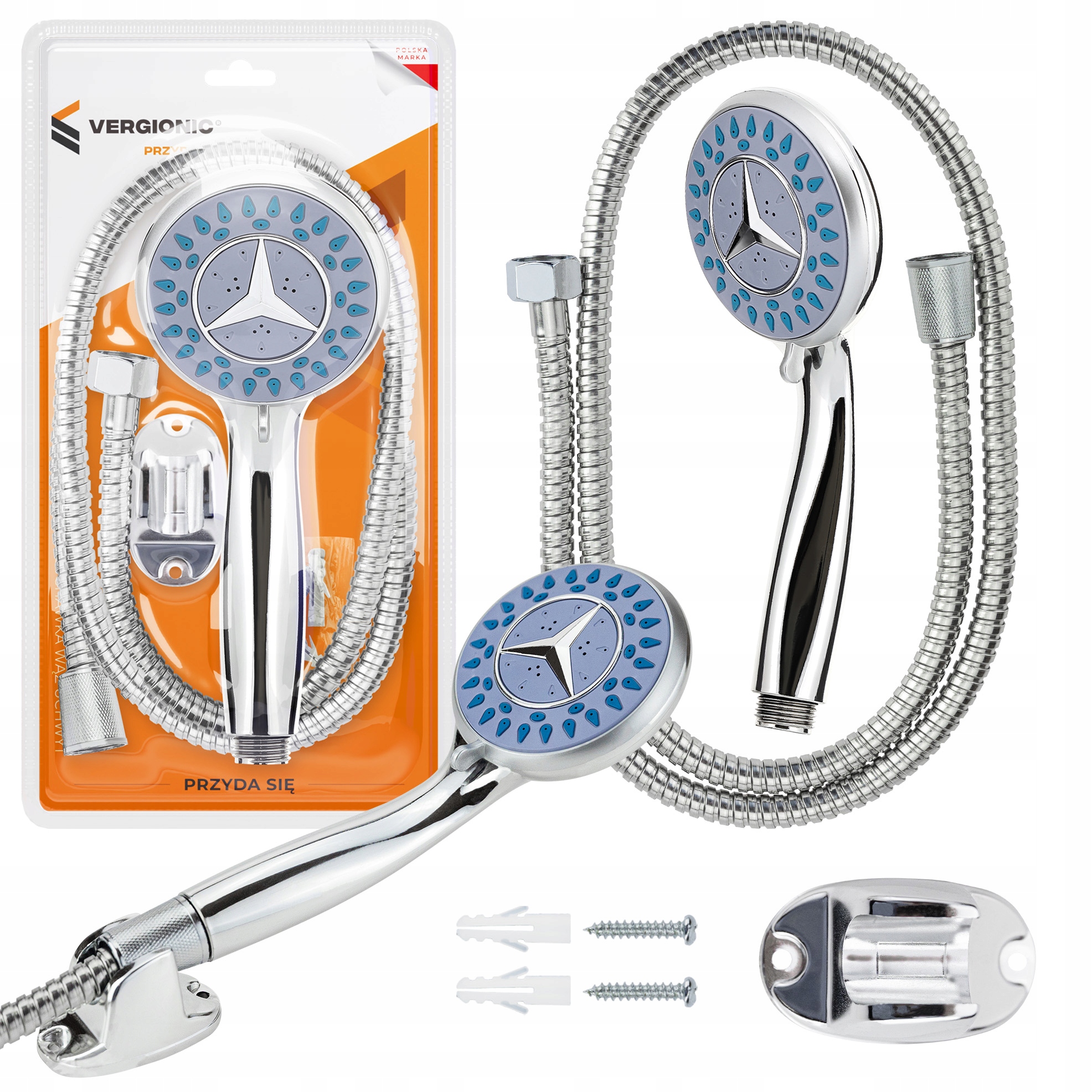 Шланг заканчивается двумя резьбами 1/2 дюйма.Предназначен для подключения к душевой кабине ванной комнаты – душевой кабине или ванне. Душевая лейка с 3-ступенчатой регулировкой струи воды. Изготовлена из высококачественного пластика хромированного цвета, устойчивого к высоким температурам и трещинам.