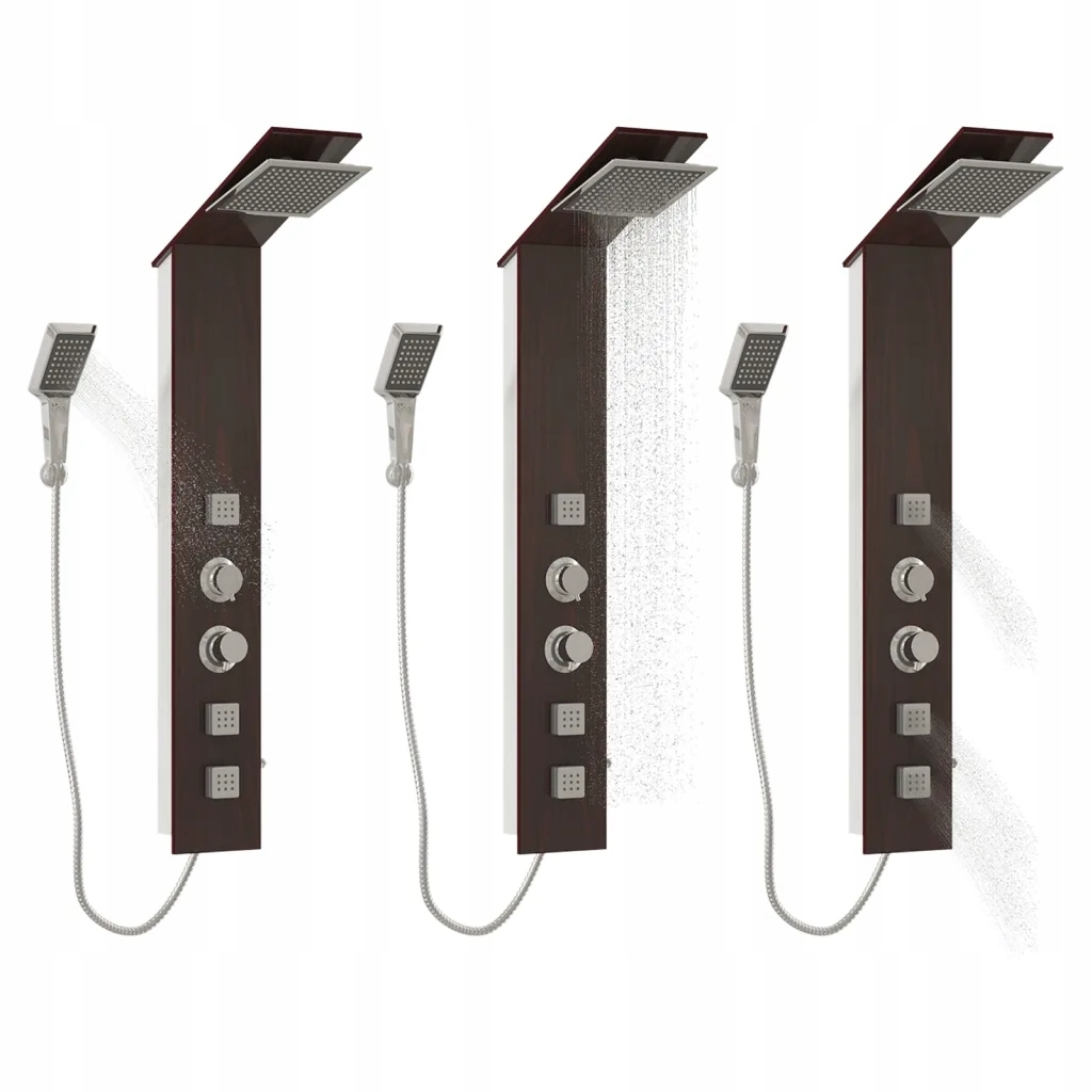 Душевая панель изготовлена из высококачественного стекла с красивым принтом под дерево. Он имеет три функции: тропический душ, массажные форсунки и ручную душевую насадку, которую можно легко выбрать с помощью ручки.