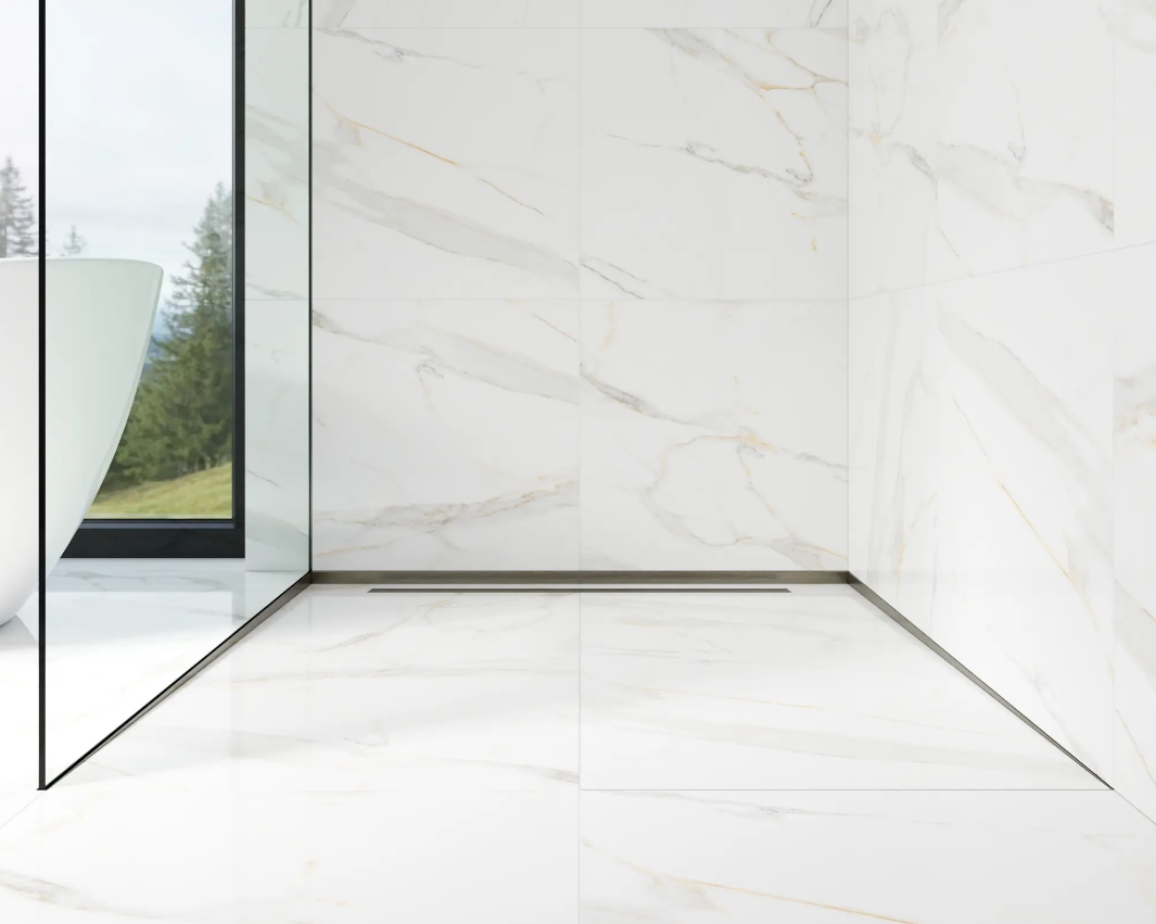 Цвет Gunmetal идеально сочетается с современной душевой арматурой, поэтому наклонная планка этого оттенка является не только функциональным, но и эстетическим завершением душевой зоны. Планка душевого поддона допускает уклон 2% к линейному сливу, что устраняет необходимость разрезать плитку на конверт. Он позволяет получить ровную, чистую линию в душевой зоне и одновременно маскирует торцы плитки по краю душевого поддона. Благодаря такому решению душ приобретает эстетичный и технически изысканный вид. Изготовленная из нержавеющей стали и окрашенная по технологии PVD, полоса обеспечивает долговечность и устойчивость к влаге и повреждениям. Металлическая отделка идеально вписывается в современную ванную комнату, подчеркивая ее целостный характер.