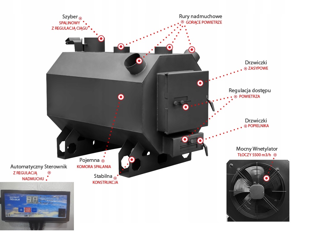 Печь оснащена полностью автоматическим контроллером обдува с дополнительной функцией регулирования скорости обдува, обеспечивающей безопасную и эффективную работу вентилятора. Задача контроллера - включить вентилятор при достижении температуры печи нужного значения и выключить его, если он потухнет в котле или температура упадет ниже температуры, установленной на контроллере.