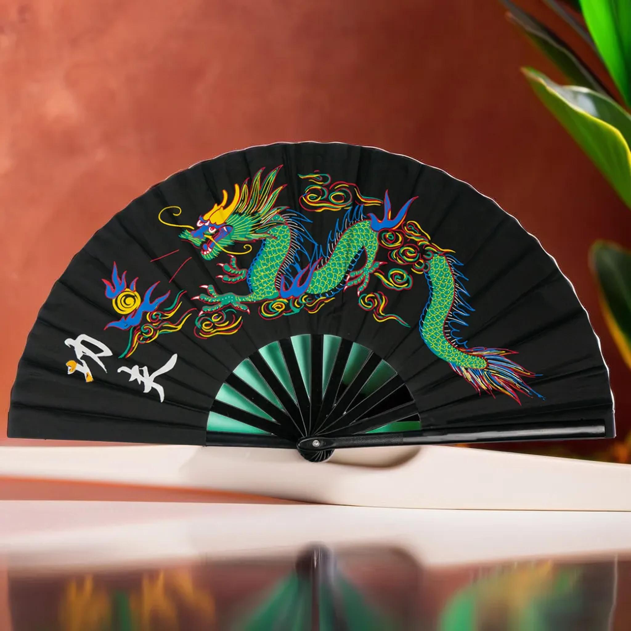 Duży składany wachlarz czarny z smokiem, 33x64 cm, z plastiku/nylon