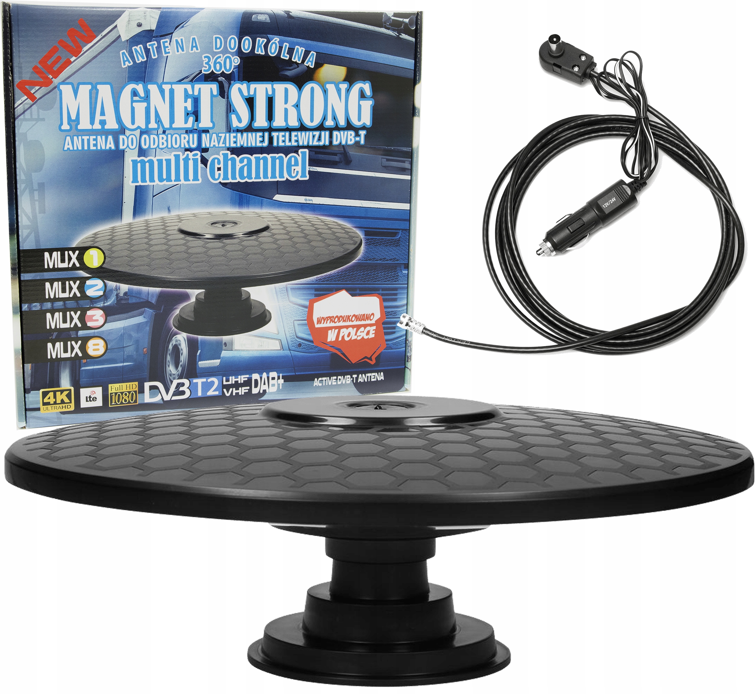 Антенна DVB-T2 MAGNET STRONG WIEDYSKA чрезвычайно проста в установке. В комплект входит стабильная магнитная основа длиной 9,5 см, которую вы можете легко прикрепите его к кузову вашего автомобиля. Безопасные антенны можно использовать на кузове только при неподвижном автомобиле.