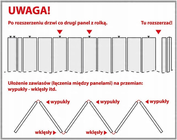 * Обратите внимание: при увеличении ширины двери следите за тем, чтобы черный ролик, расположенный в верхней части панели, был установлен в каждую секунду панель (в передней панели с ручкой имеются два ролика). Производитель не рекомендует устанавливать ролик в каждую панель.