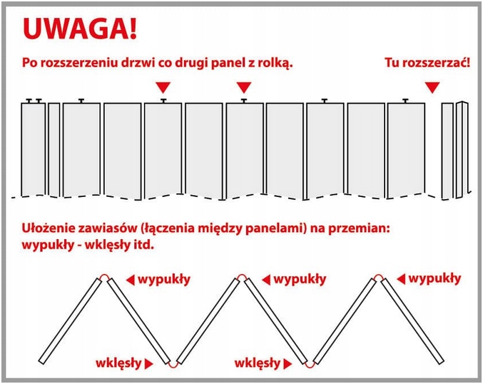 * Обратите внимание: при увеличении ширины двери следите за тем, чтобы черный ролик , расположенный в верхней части панель, монтировалась в каждую вторую панель (в передней панели с ручкой два ролика). Производитель не рекомендует устанавливать ролик в каждую панель.